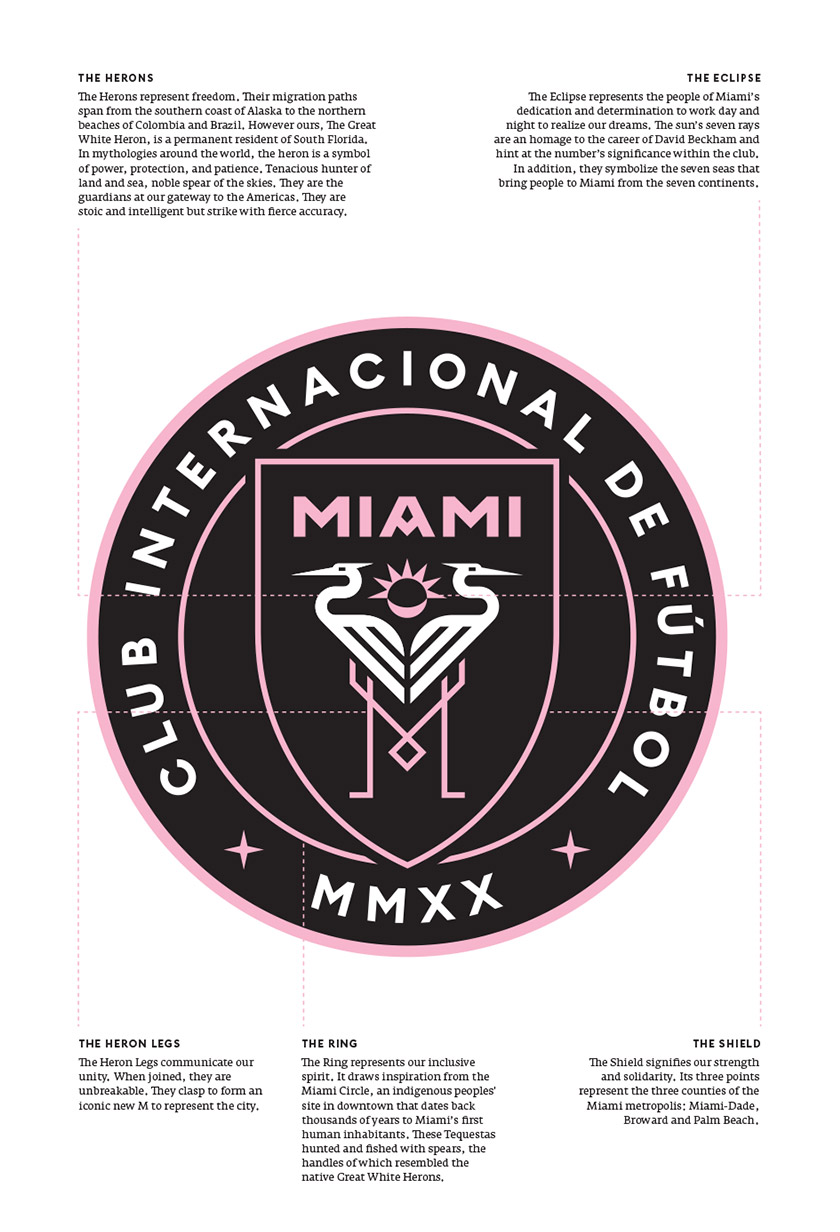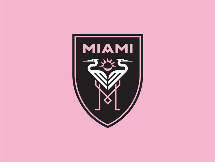 国际迈阿密的LOGO以黑色和粉色为背景,两字苍鹭背靠背站立着,背景是日食。俱乐部的座右铭是Libertas,Unitas,Fortuna,意思是所有人自由、团结包容和好运的概念。
