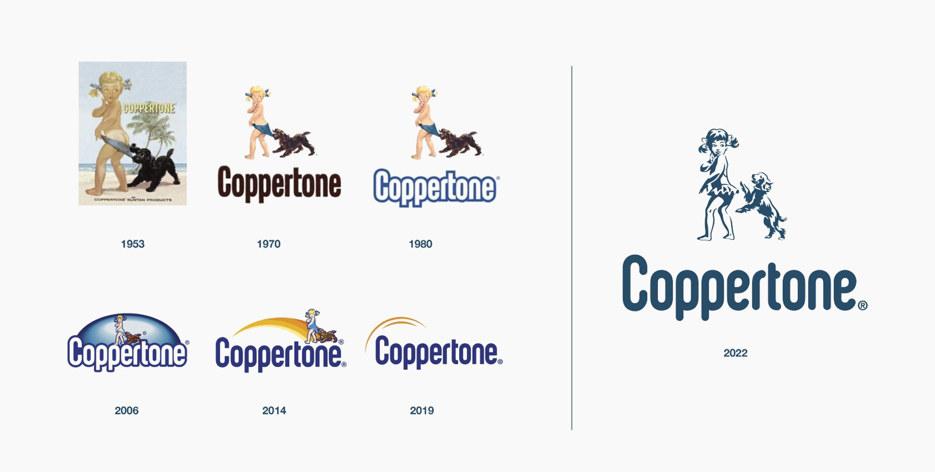 在随后的40多年里,Coppertone 的LOGO虽然有过几次重绘,但让人印象深刻的小女孩和可卡犬一直是其核心部分。2014年,重新设计的小女孩穿上了一件完整的蓝色裙子,使其不再那么暴露,更具包容性。