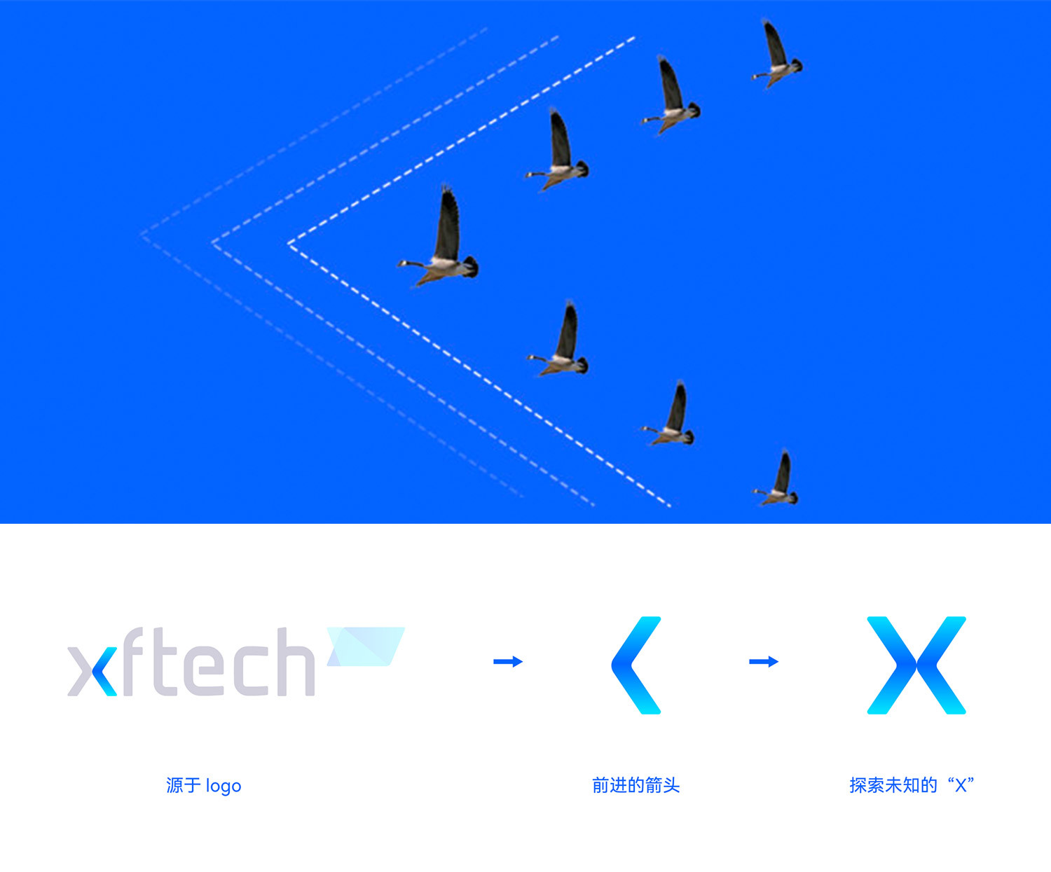 信飞原来的LOGO由图标和中英文字标两部分构成,图形上一眼辨别出「信飞」这个品牌想传达的信息,且原蓝色较为传统。全新设计的LOGO由四部分组成,其中包括英文字标「xftech」、中文字标「信飞」、一个蓝色渐变的图标和「X」符号。