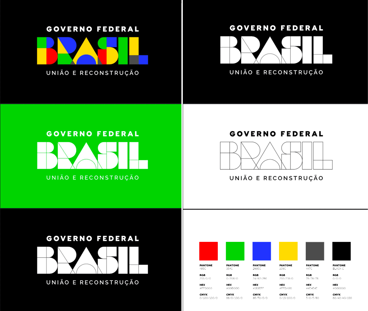 新标志由红色、蓝色、黄色、绿色和黑色几何色块叠加出大写的「BRASIL(巴西)」彩色字母。字母的顶部标有黑色的「联邦政府」字样,底部写有新的主题口号「União e Reconstruction(团结与重建)」。
