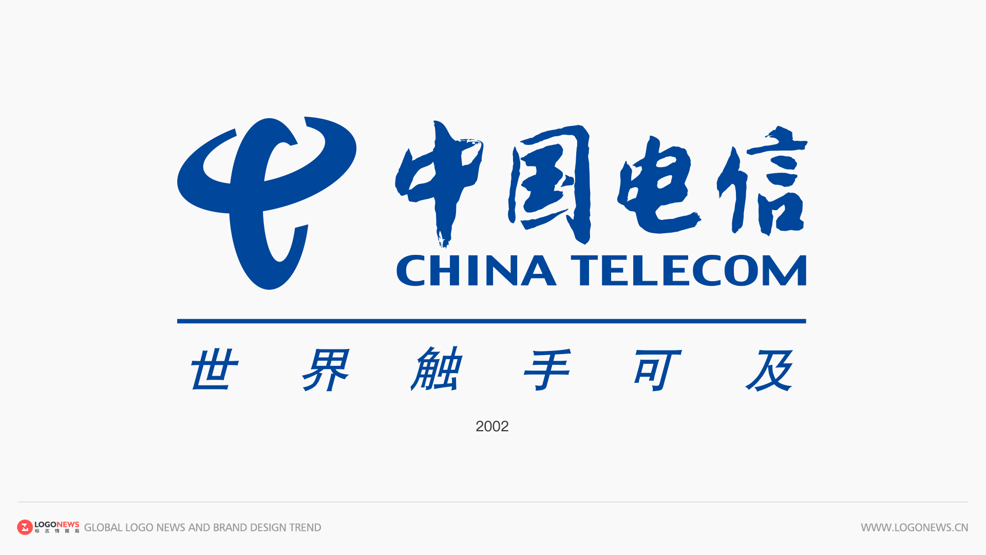 2002年,中国电信企业借拆分重组之际,弃旧换新,推出了目前我们所熟知的「中」、「C」组合相似「牛角」的新LOGO以及企业形象口号「世界触手可及」。近年来,LOGO和口号组合的应用形式逐渐被单一的LOGO所代替。不过中国电信集团有限公司的官方网站(chinatelecom.com.cn)目前用的还是口号和LOGO组合版,而且颜色也没有更新。