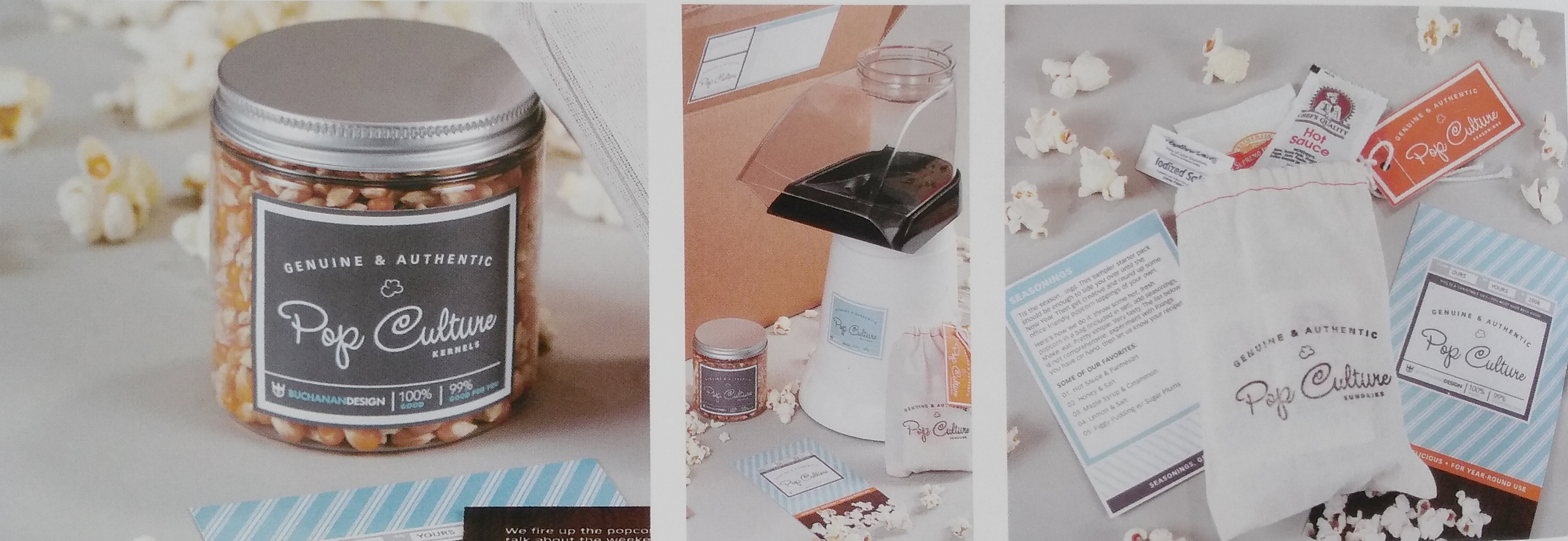 这个看起来很“美味”的圣诞节礼物包含了一台爆米花机,一盒备用的玉米,一整箱香喷喷的爆米花和庆祝用花环以及其他物品,所有的标签上都有写着“波普文化”。所有的这些都是装在这个箱子里所有的东西都和整个主题相关,这样丰富的表达方式增加了产品内容的丰富性和趣味性。