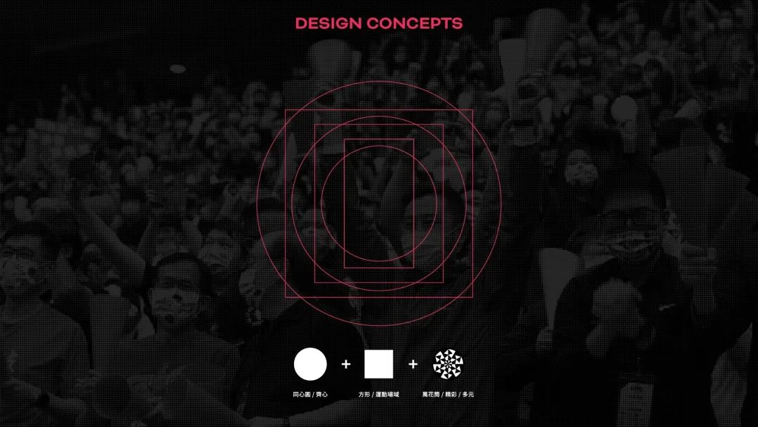 家的齐心——同心圆/方形结构的运动场——四方型以及代表回忆与精采赛事——万花筒结构,发展出新视觉系统与LOGO。