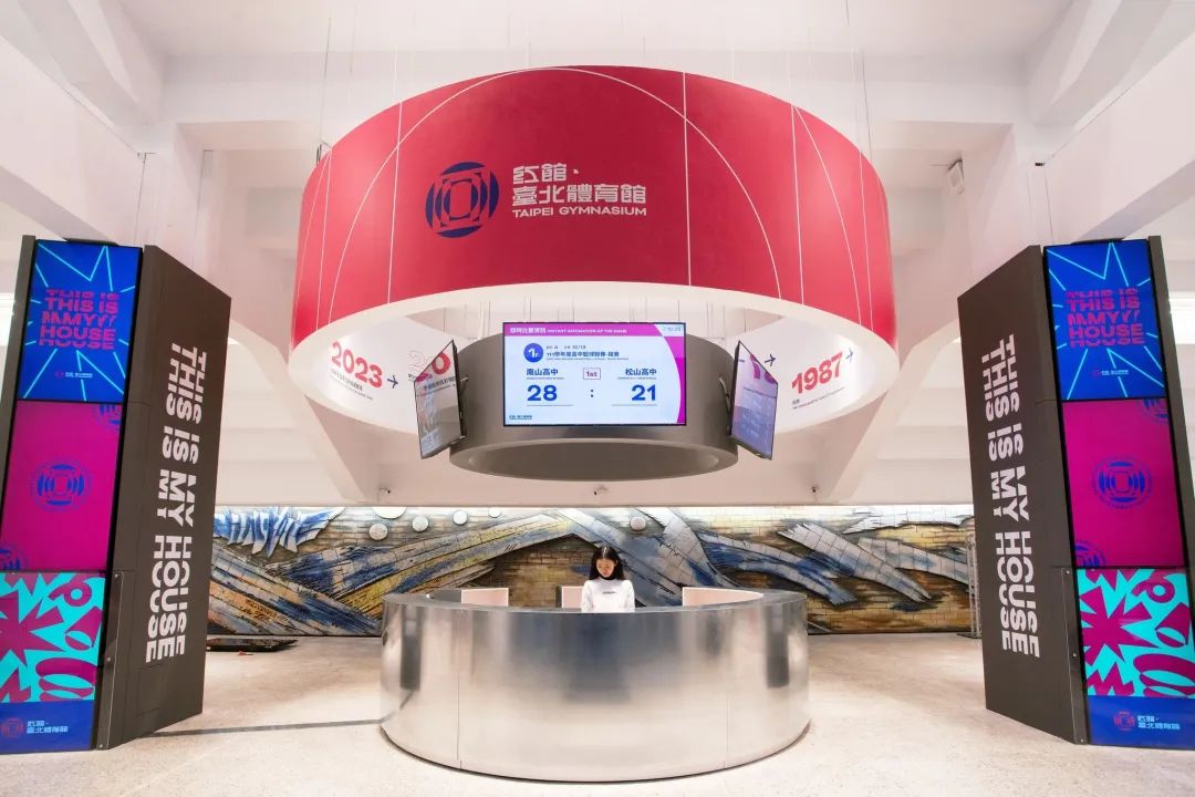 台北体育馆空间再设计来自无有设计,改造工作结合了新标志的造型。入口新增设同心圆结构的服务台与无障碍柜台,同时增加设数字面板与加强沟通 设计,包含统一的形象视觉、场馆形象动画的播放以及现场赛事 ,让前来比赛的选手与民众,走进场馆就可找到所需讯息。